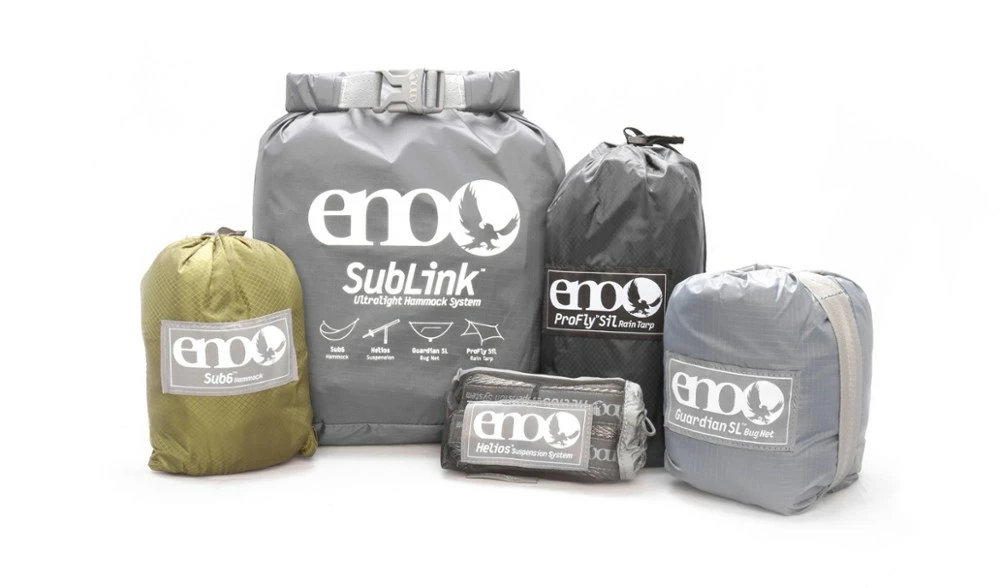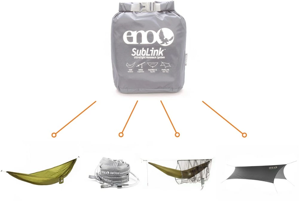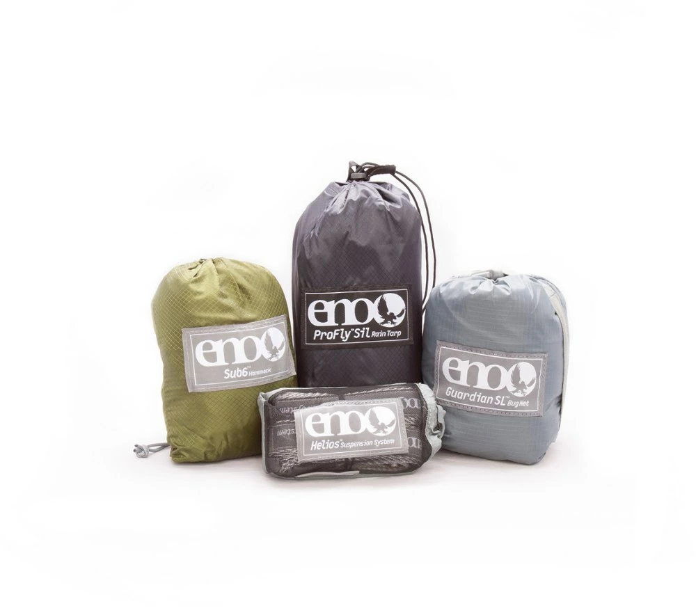 - Includes: Sub6™ hammock, Helios™ suspension system, Guardian™ SL bug net, ProFly™ Sil rain tarp and storage bag